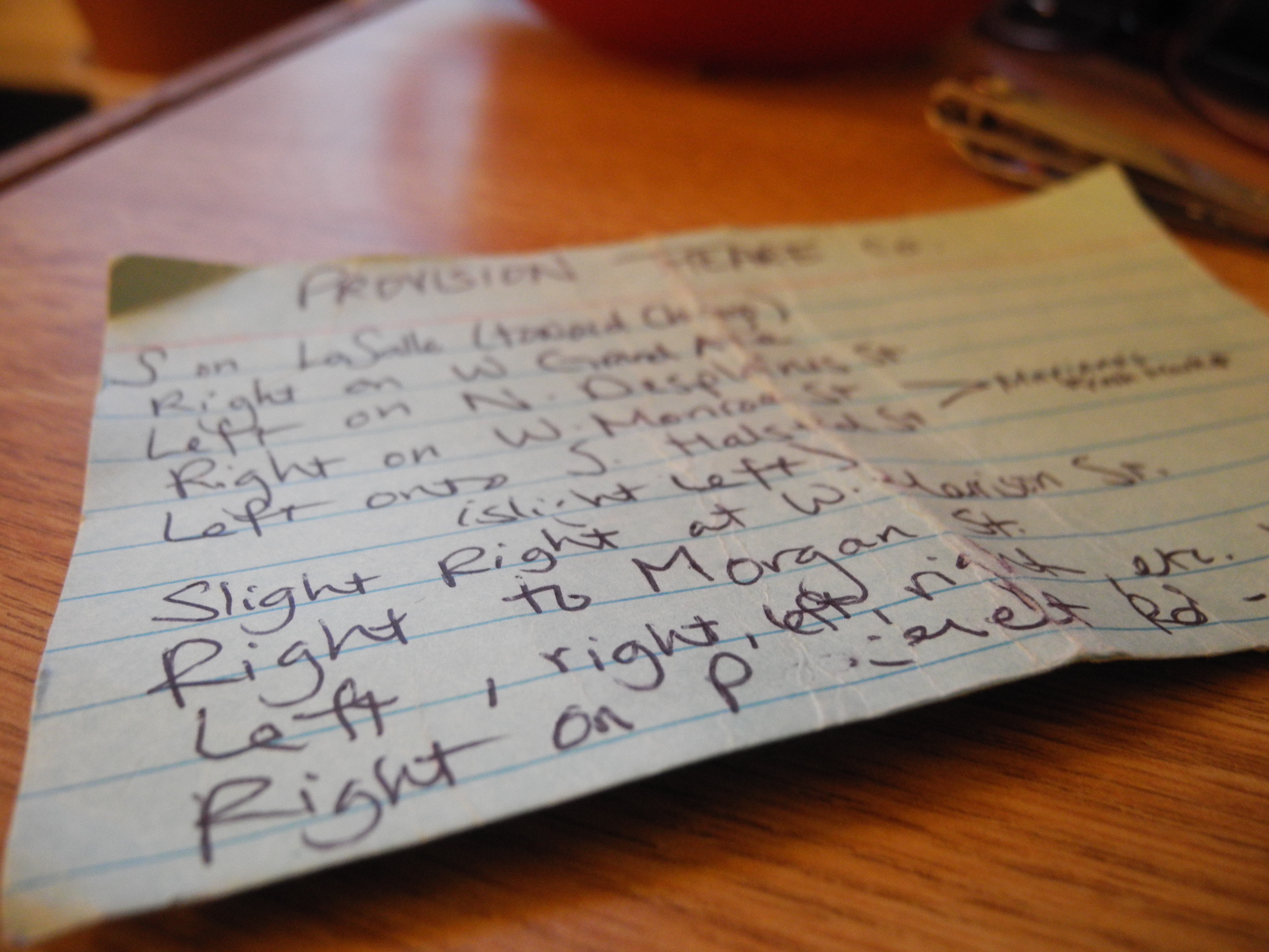 My friend has already experienced this. As we set off on our route, she asked to see the instructions. I handed over the green index card with an explanation, “I wrote the second half as I was Skyping my family…”