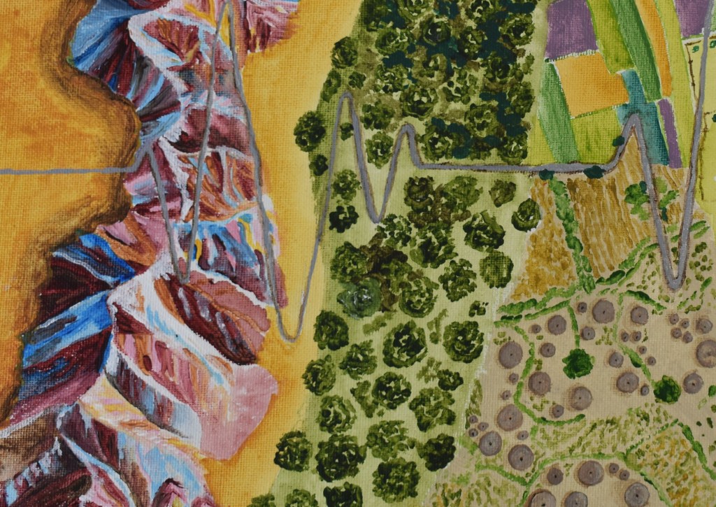 I’ve been shown many models of Christianity. But in Congo, I’ve seen the drawings of forgiveness, of dealing with trauma, of the Christian life, and it’s always circular roads between villages. You go from one to the other, and sometimes you backtrack, lose your way, get lost, and keep coming back and journeying on. My art is a statement that I am between villages, with the hope that as I pass through valleys of weeping, God will make springs and bring His own rain of blessings. The hope that the highways in my heart will bring me to His face and that He will be strength, and will always be enough.