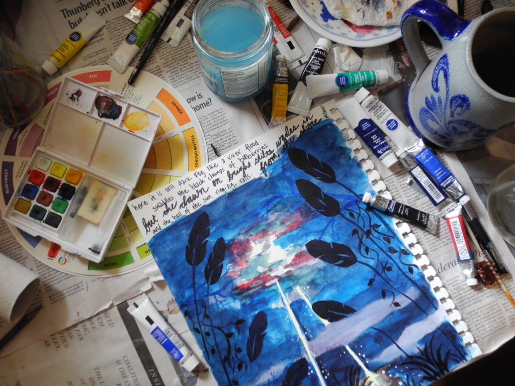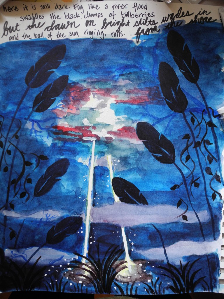And let it play with your imagination. I started painting without knowing where it would take me… and yes, I know that it is by no means a perfect painting. That’s not the point. 😉 I don’t know billberries, so I painted the tropical plants I know well and was surprised at how my leaves look like feathers. At the last minute I added spots of light around the stilts and they became stars, turning the ground into the sky; or bubbles, rising up from the stilts as the dawn wades through deep water.