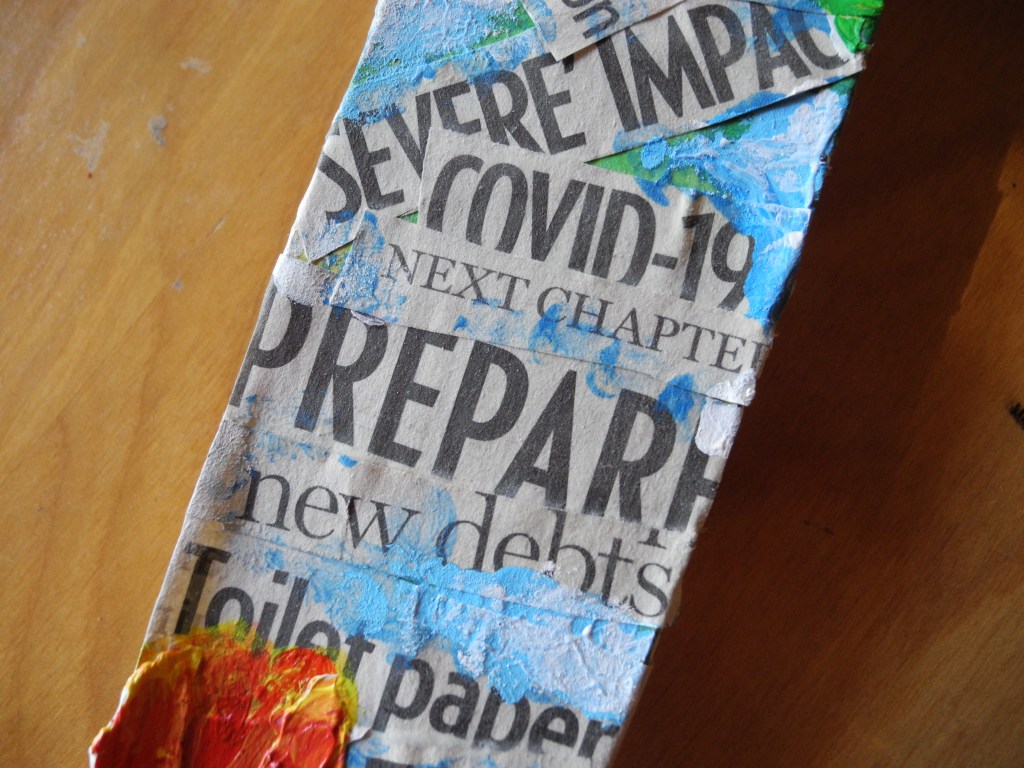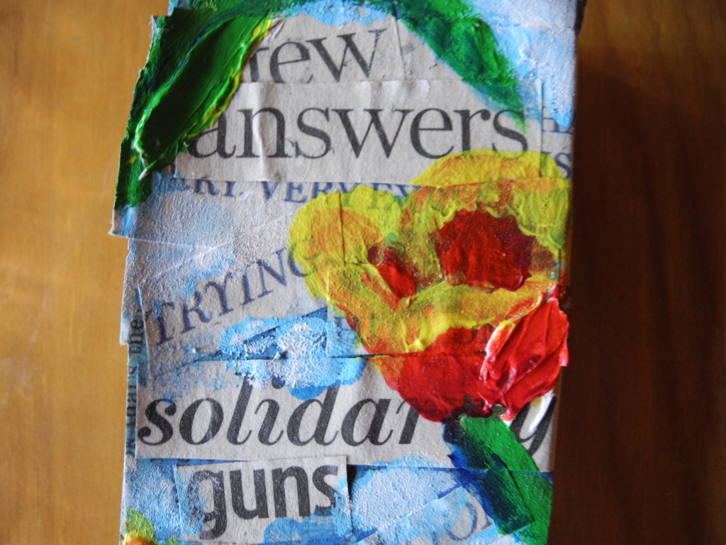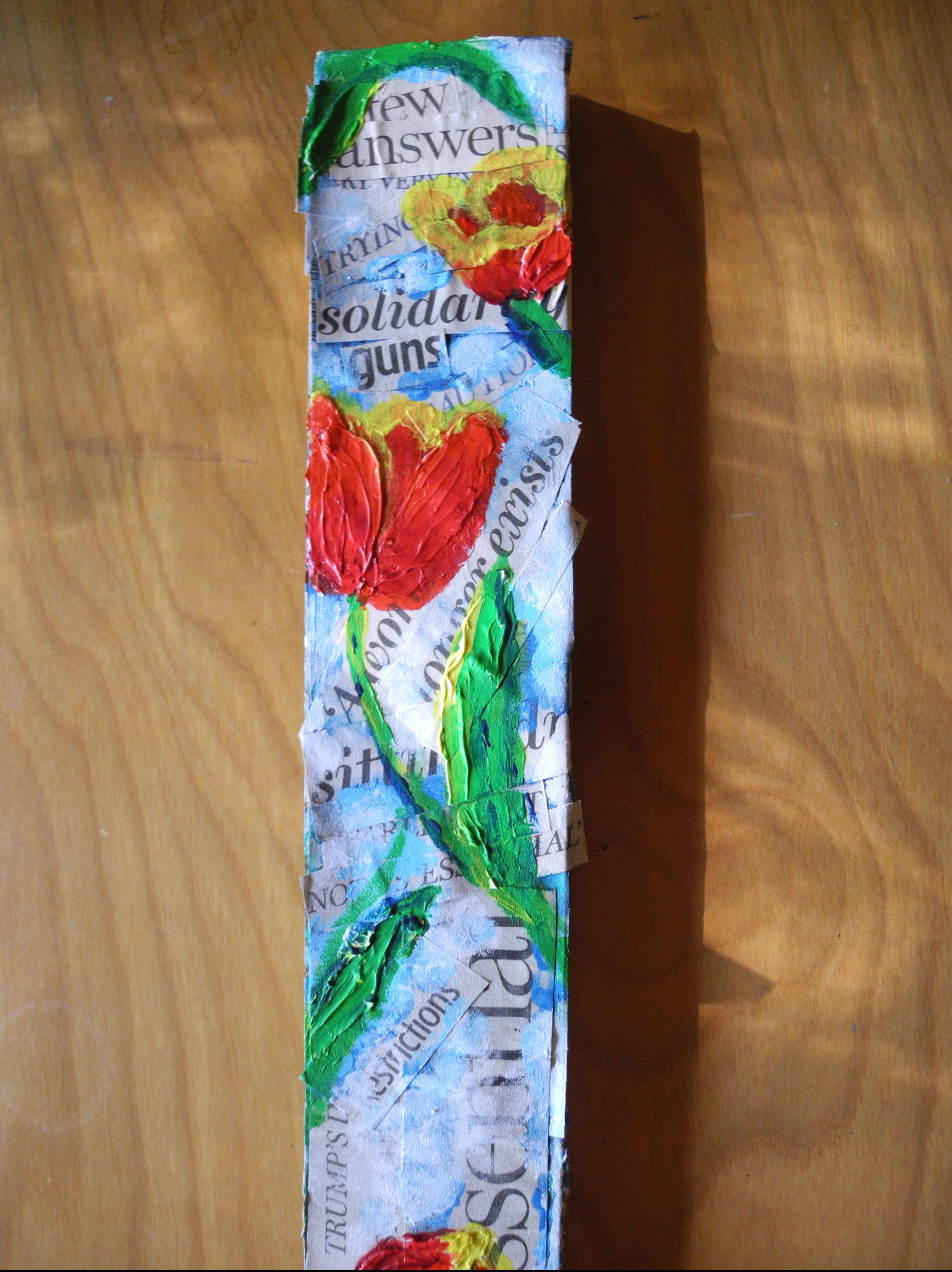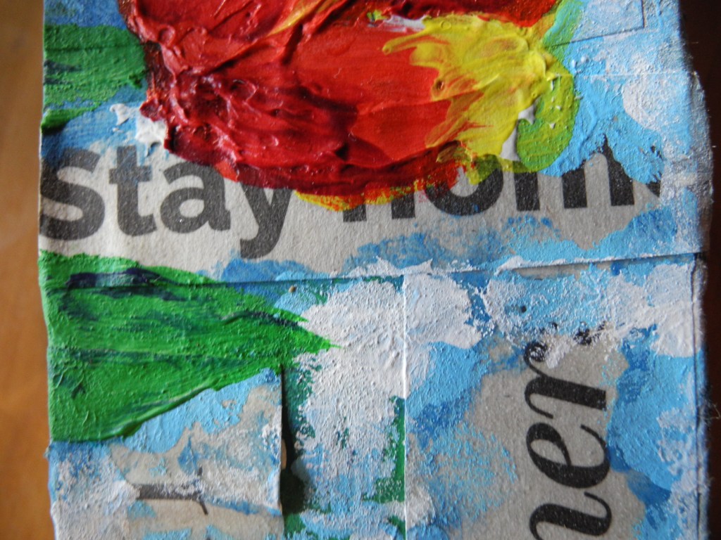 Today’s “poem” is a collage of headlines I pasted onto a narrow piece of wood a few weeks ago. Unfortuanately I only had a glue stick so some of the edges started curling. I put it together while working on an article on the Liberation of Holland, hence the tulips.