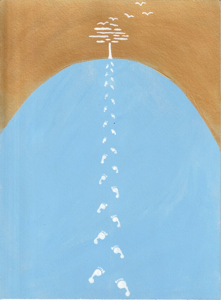 I wrote the poem first and it inspired the painting; white footprints walking up a blue hill (reminiscent of the time between sleep and waking) and turning into a tree, and then a flock of birds. Earlier this year I wrote a newsletter about snakes & resurrection, also inspired by this painting. You can read that here.