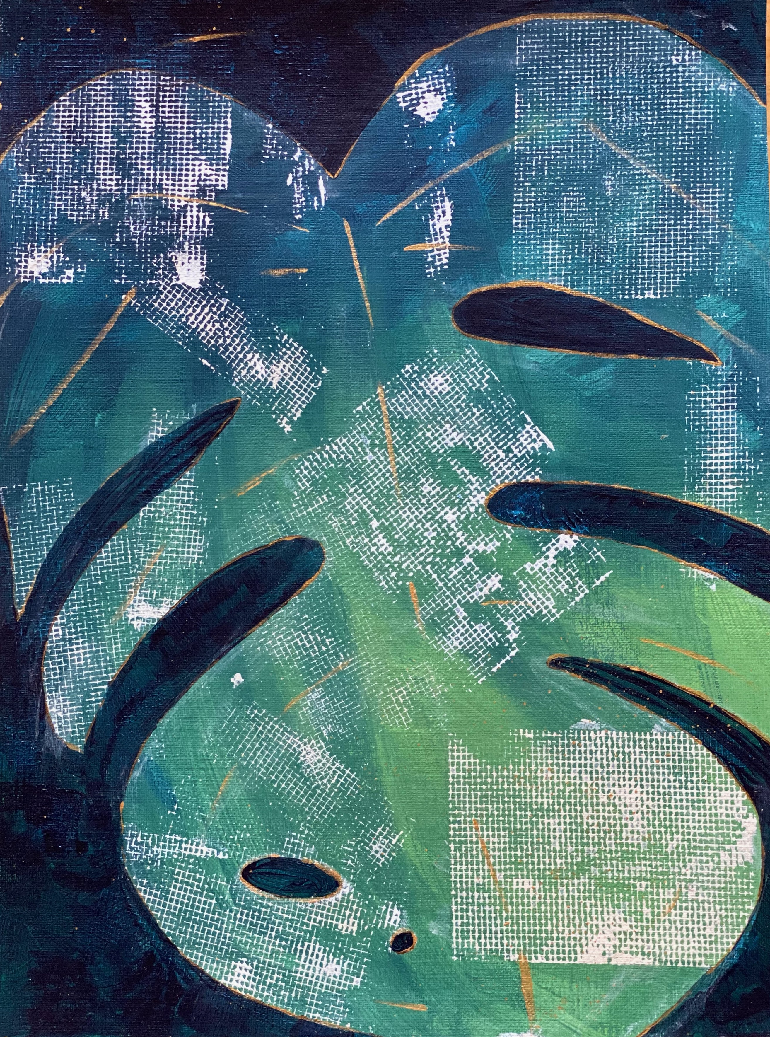 As a child I was captivated by the “Just So” jungle stories. This monstera leaf is just as playful and vibrant, carrying texture stamped on with a small piece of window screen.
