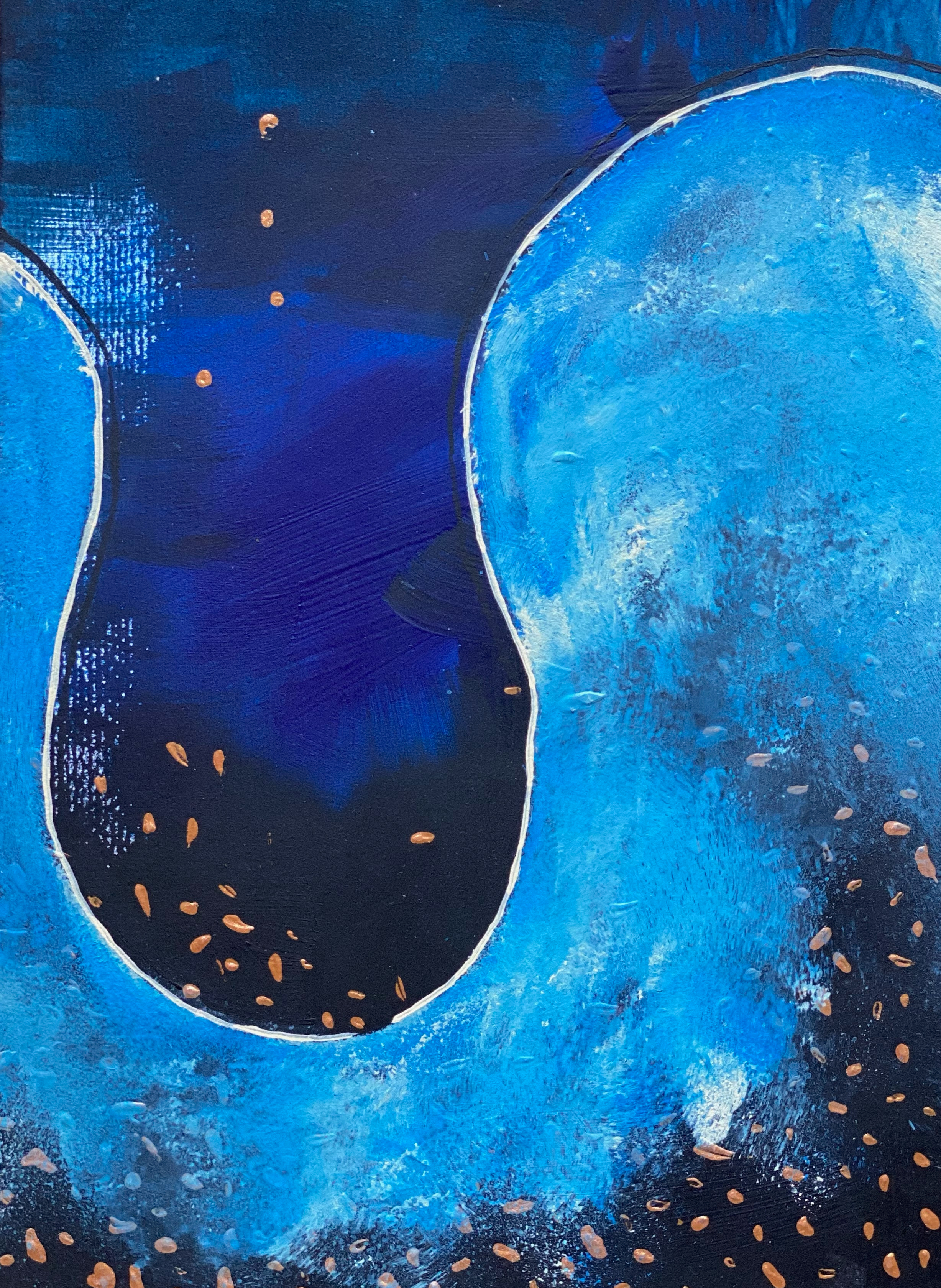 I can’t resist a beautiful, minimalist painting! The idea of this one is simple but the texture is everything: gold marks under the pale blue leave raised marks, and the canvas paper is visible on the left side. It’s inspired by Maggie Smith’s question, “What else is possible?” It’s up to you whether the dots are rising or falling.
