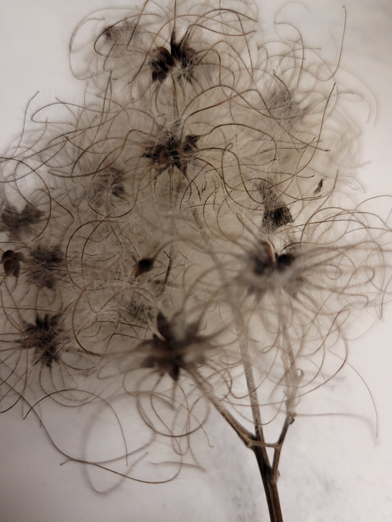 If you want this little (5×7 inches) watercolour, it’s selling at $15, shipping included. Email me at abrokentulipinbox@gmail.com if you’re interested! Just know that the colours will “settle” into variations of gray and brown with time. It’s painted with foraged inks — no rust (yet) but there is dogwood fruit ink (the pale yellow) privet berry ink (purple, turning to blue when it bleeds into the dogwood) and walnut ink (for the feet and neck). The marks on the bottom are made with the wildly spiralled seeds of clematis virginiana (also known as Devil’s darning needles!). Here’s the plant: