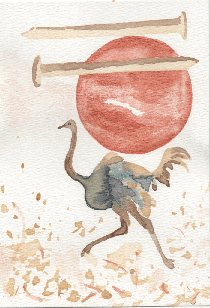 I have always wanted to run like an ostrich. When I was a child, I thought I could. The trick was to run watching my own feet, until the paved stones of a housing complex in Nairobi, Kenya, began to blur. The ostrich is earth’s largest bird, our fastest bird, and can kill a lion with one kick. I didn’t think about that part where the ostrich hides her head in the sand to escape danger.
